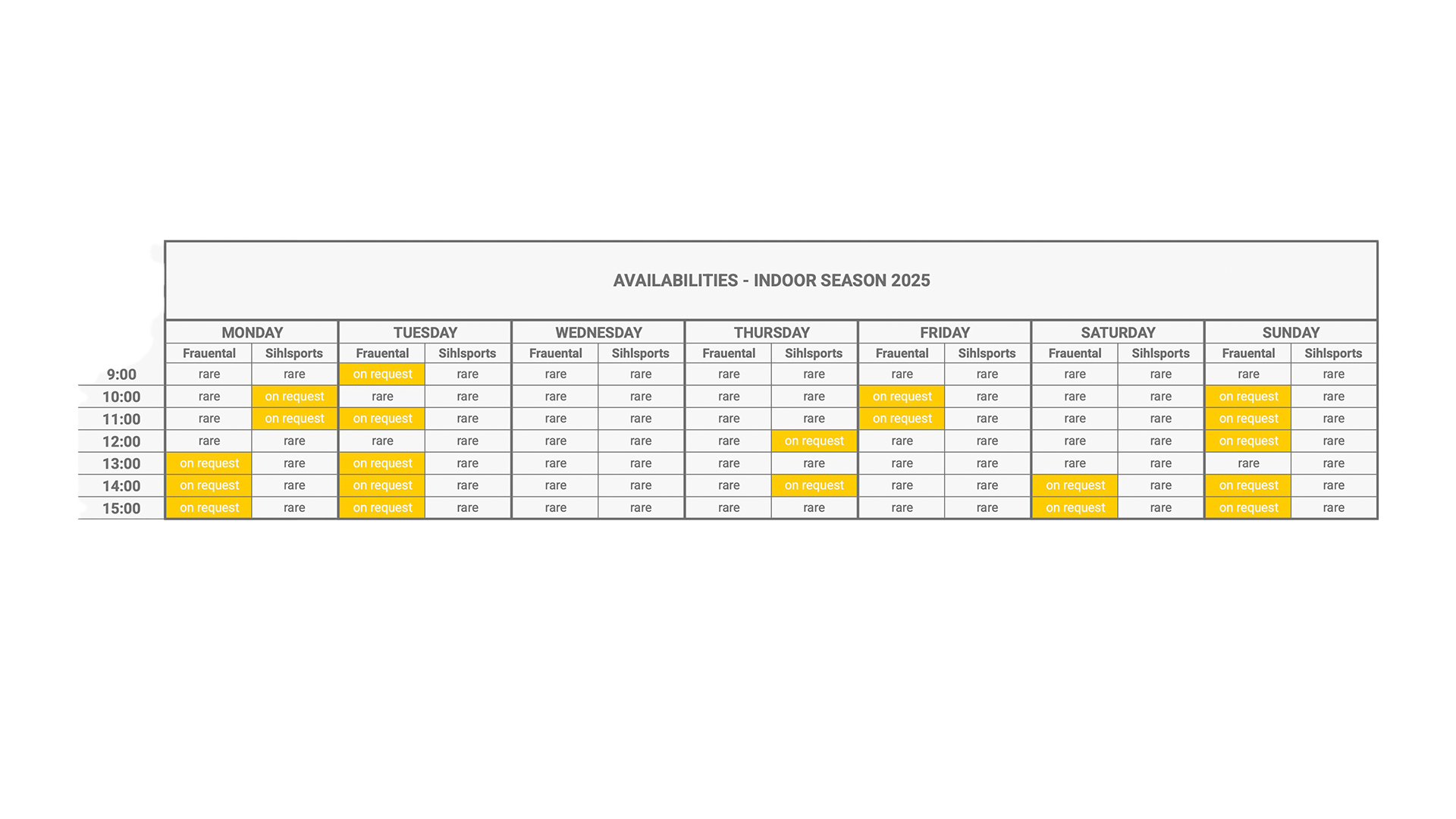 ..indoor availabilities are constantly in motion and we are not able to provide most of the slots in our online booking system. If you’re interested in playing, we suggest to send requests with your preferred days and times. You can contact us via email or whatsapp/sms. We’re looking forward to seeing you on court!